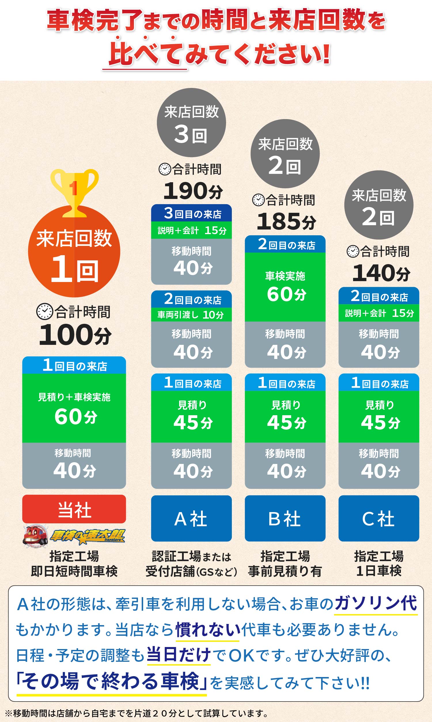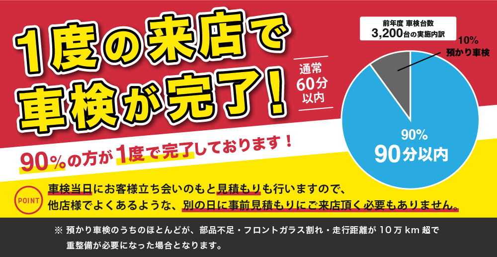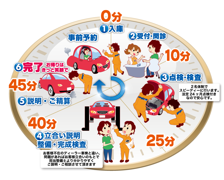 「車検の速太郎」廿日市店は、短時間車検を基本としておりますが、